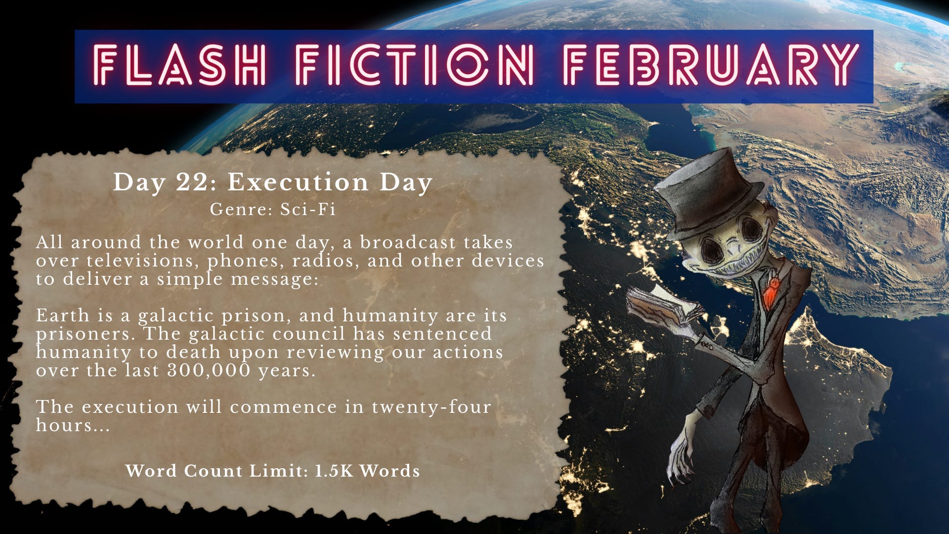 As such, I, Debrac Fee’bol, Warden of Prison Planet 3.4022e, have the duty to declare that the Execution of your species will commence in 24 Earth hours.
